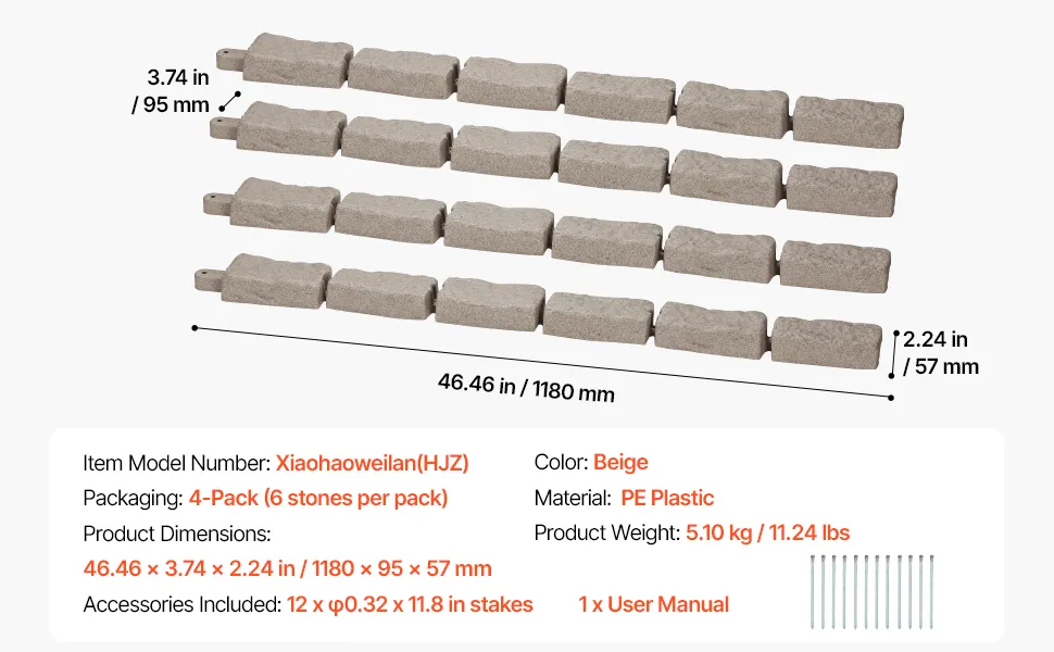 VEVOR Bordatura per Prato in Finta Pietra 1180 x 57 mm Bordatura per Cortile Resistente allo Sbiadimento, Dimensioni di Mattone con Punte di Ancoraggio, per Vialetti, Passerelle, Beige, 4 Pezzi