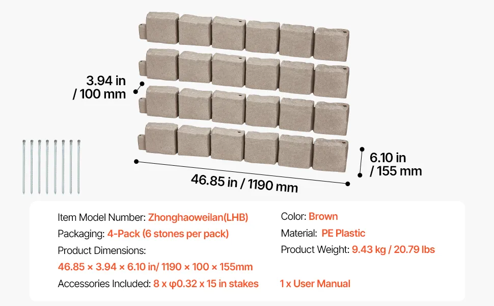 Con un peso di soli 2,0 kg (4,4 libbre) a pezzo, ogni mattone per bordatura da giardino è facile da spostare, regolare e installare, anche da una sola persona.
