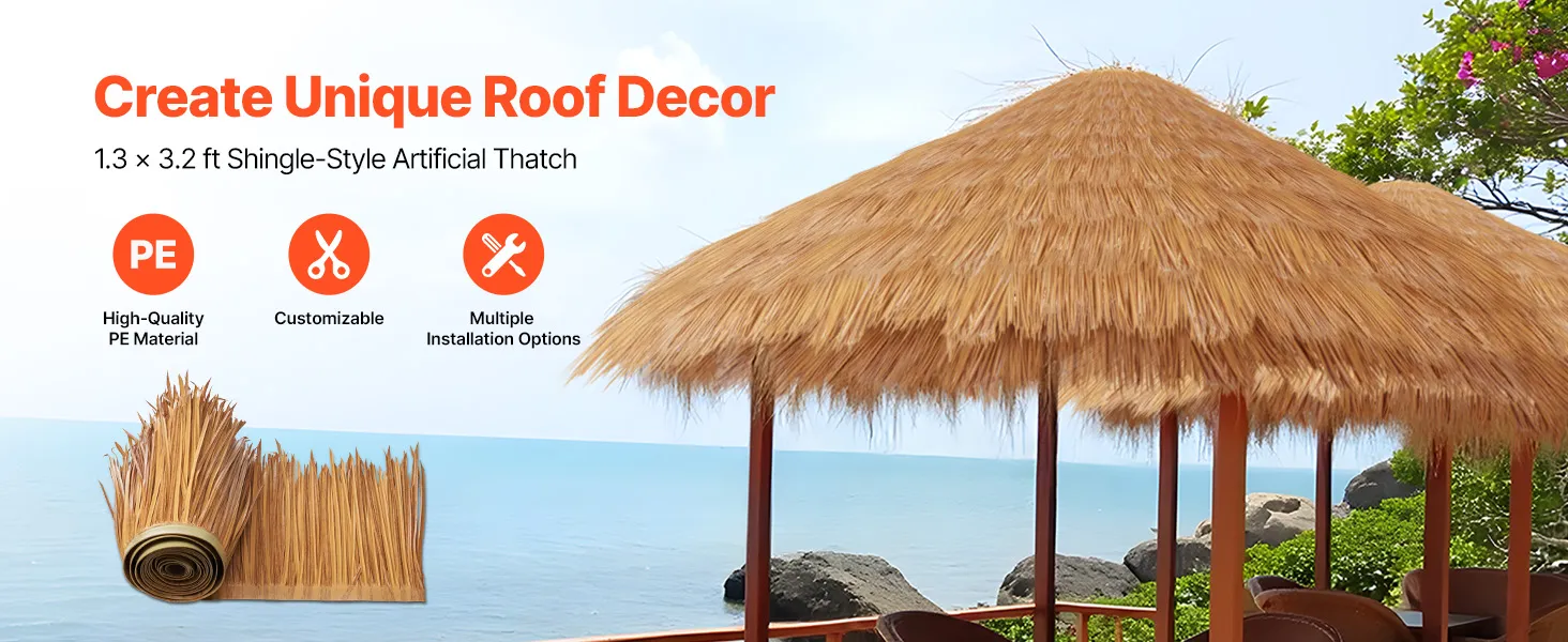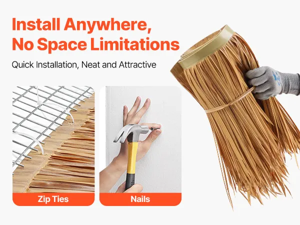 Adatto a superfici piane o irregolari, il tetto in paglia può essere installato rapidamente con chiodi o fascette, senza bisogno di attrezzi complessi. Ottieni una finitura pulita ed esteticamente gradevole senza sforzo.