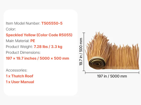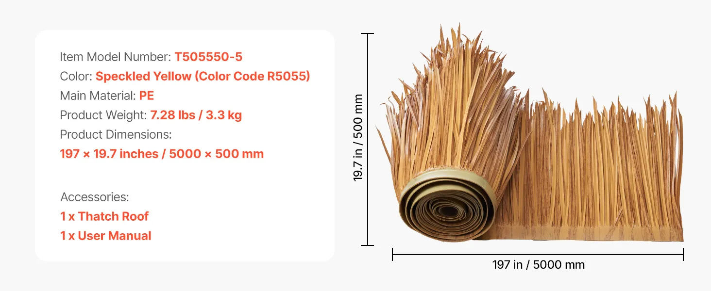 VEVOR Tetto in Paglia Artificiale 0,5 m x 5 m Rotolo di Tetto in Paglia in Stile Messicano, Impermeabile e Ignifugo, per Gazebo Palapa, per Patio, Piscina, Spiaggia, Feste Hawaiane, Giallo Maculato