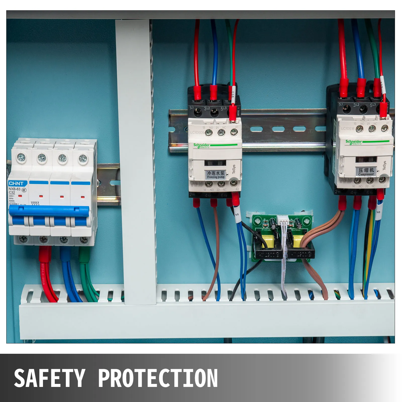 Raffreddatore di acqua industriale dotato di protezione da sovraccarico di corrente, interruttore di alta e bassa pressione, ritardo elettronico del timer e sistema di visualizzazione guasti.