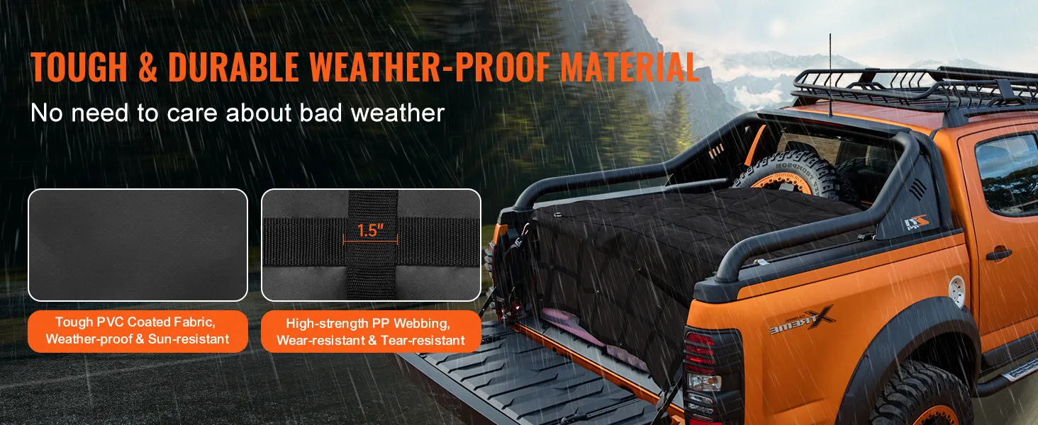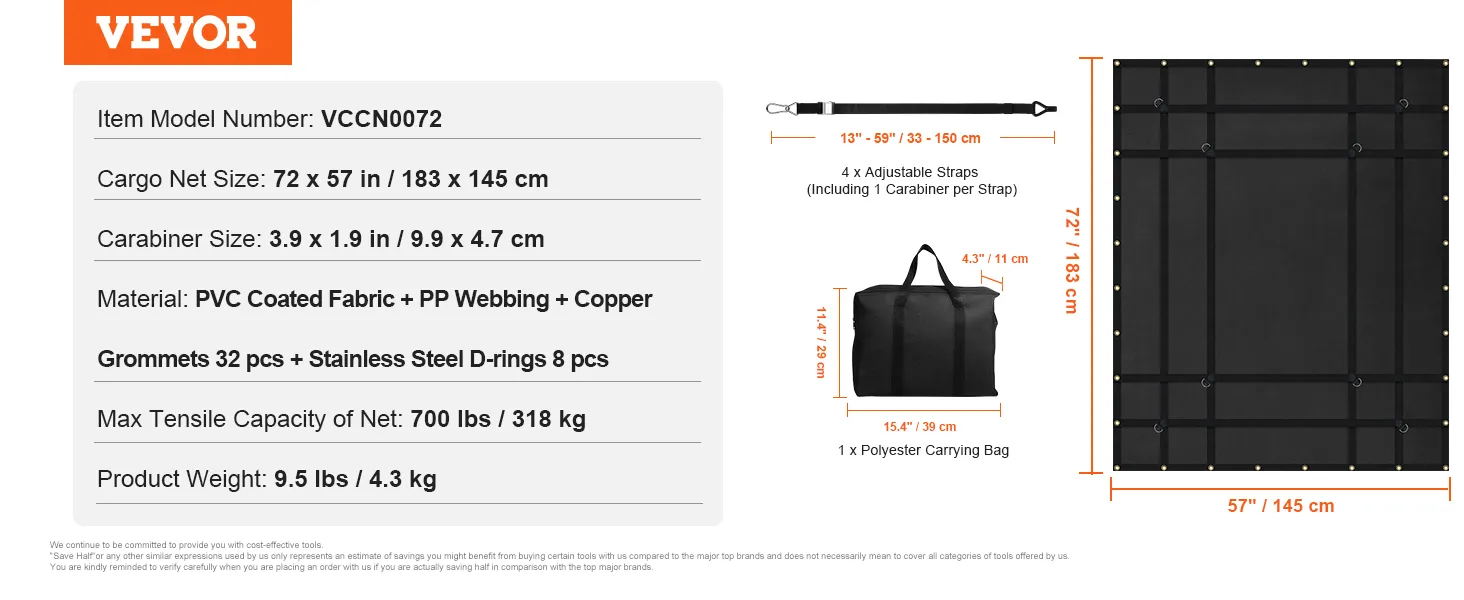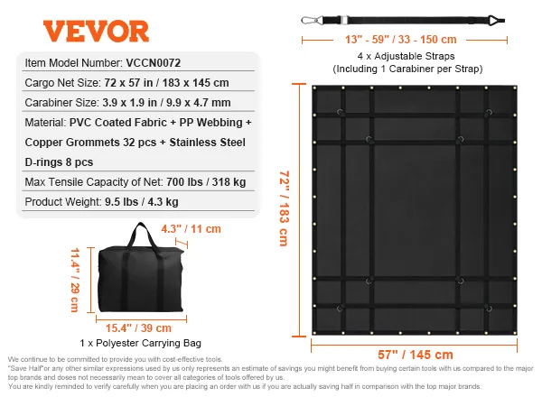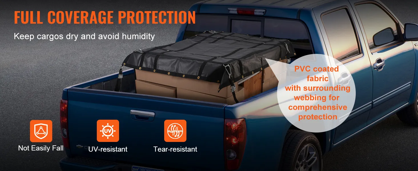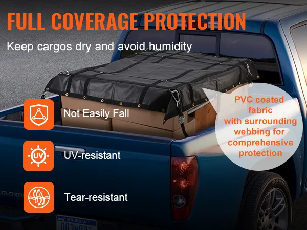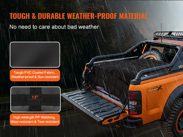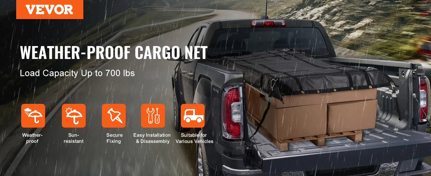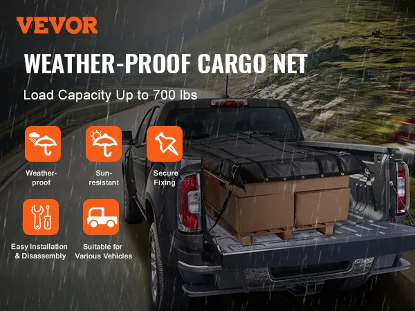 La rete per carichi VEVOR ha una capacità di carico fino a 700 libbre/318 kg, resistendo facilmente a tutti i tipi di vento e pioggia estremi e proteggendo i carichi da umidità e danni.