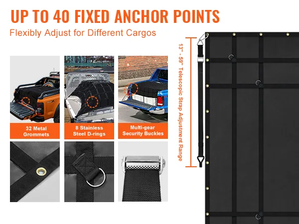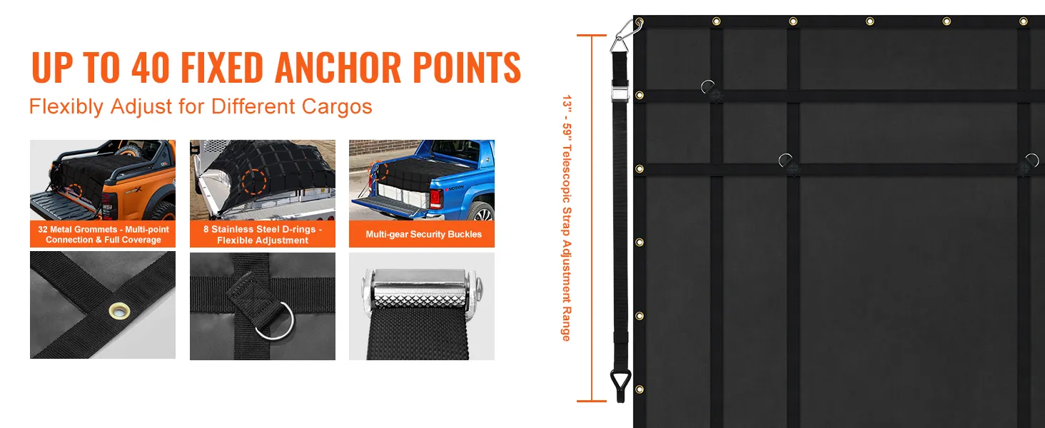 Adattamento flessibile a vari carichi: la rete da carico resistente alle intemperie VEVOR è dotata di fino a 40 punti fissi in metallo, dotata di cinghie regolabili da 13" a 59"/330 a 1500 mm e fibbie multi-marcia. Quindi puoi usare le fibbie metalliche in dotazione per regolare i punti fissi in base alle diverse dimensioni e forme dei carichi, secondo necessità.