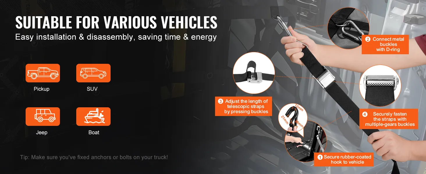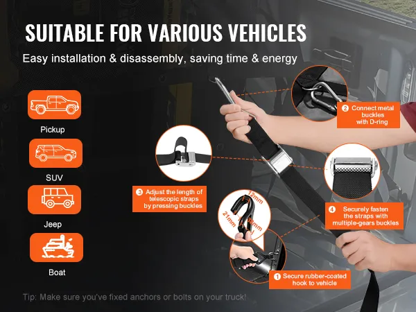 Facile installazione per vari veicoli: l'installazione e lo smontaggio sono molto semplici. Devi solo collegare i ganci rivestiti in gomma all'auto. Quindi puoi facilmente fissare la rete di carico su una varietà di veicoli per l'uso, che si tratti di un camion, un rimorchio, un pick-up, una jeep, un SUV o persino una barca.