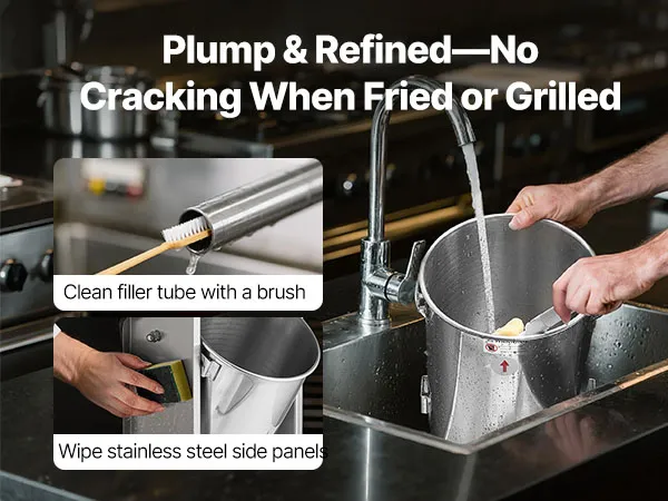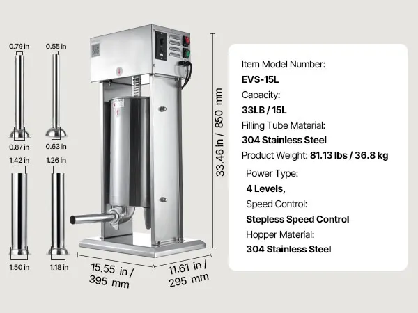 Accessori completi: questa insaccatrice verticale per salsicce include quattro tubi di riempimento SUS 304: ⌀0,63 (0,55) pollici, ⌀0,87 (0,79) pollici, ⌀1,26 (1,18) pollici e ⌀1,50 (1,42) pollici