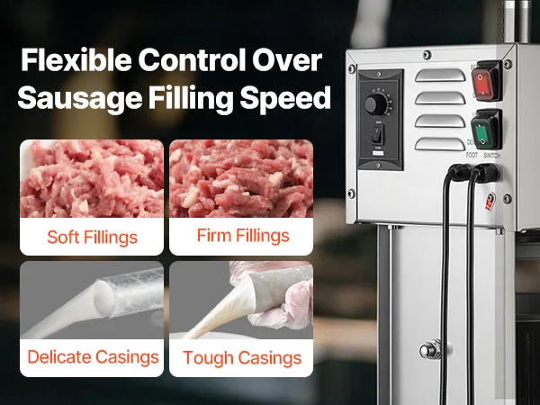 Facile da usare: questa insaccatrice elettrica è dotata di controllo continuo della velocità per adattarsi a vari tipi di carne. Abbinata a un pedale, consente l'insacco a mani libere senza premere, riducendo i tempi di preparazione