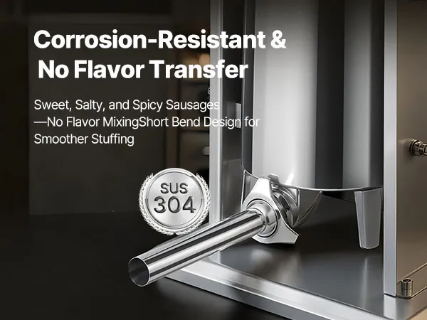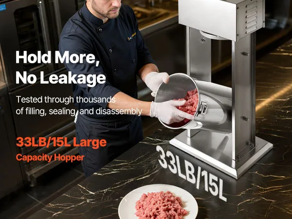 Grande capacità: l'insaccatrice è dotata di un contenitore inclinabile che può contenere fino a 15 litri di carne. Ideale per la lavorazione in lotti nelle cucine professionali, riduce le ricariche. Le parti in acciaio inossidabile sono resistenti