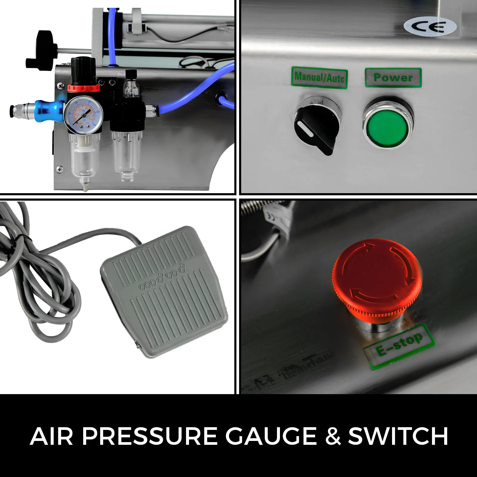Manometro avanzato per un monitoraggio accurato e in tempo reale della pressione dell'aria. Due modelli di controllo: funzionamento automatico o controllo del punto, azionati tramite un pedale. Interruttore di arresto di emergenza per arrestare e avviare la macchina in qualsiasi momento.