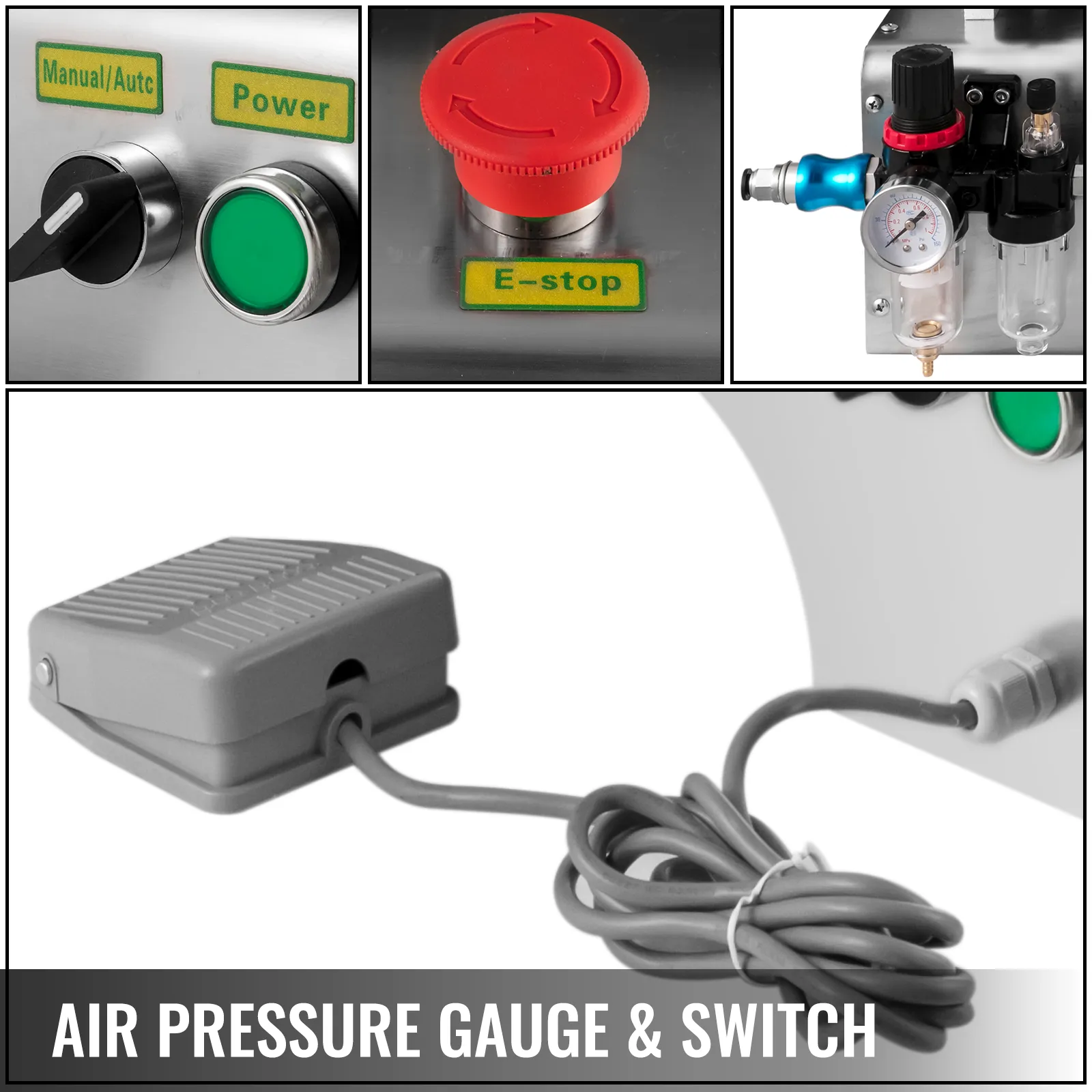 Con un manometro dell'aria, il riempitivo di liquido funziona bene con un compressore d'aria (non offerto). Supporta sia il funzionamento automatico che il controllo del punto azionato tramite un pedale. Ha un arresto di emergenza per un arresto sicuro.