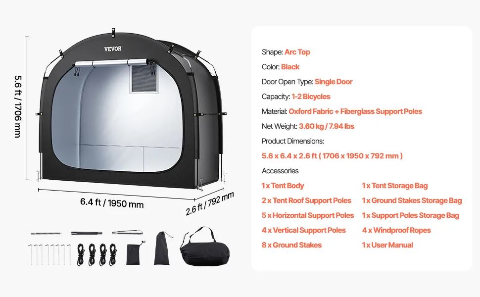 VEVOR Spaziosa Tenda per Riporre le Bici all'Aperto con Finestra Ventilata, Tenda Impermeabile Arco Superiore con Fibra di Vetro e Doppie Cerniere da 1a 2 Bici, 1950 x 810 x 1730 mm