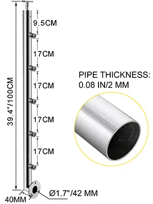 È un corrimano in tubo da 100 cm / 39,4 pollici. Il tubo di acciaio ha un diametro di 42,4 mm e il tubo tondo ha uno spessore di 2 mm rispetto agli altri. La balaustra del corrimano delle scale offre una maggiore stabilità.