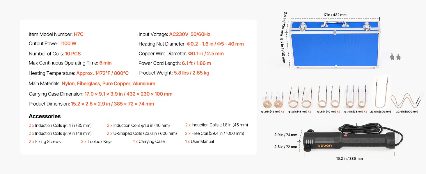 VEVOR Induction Heater Bolt Removal, 1100W 230V Magnetic Induction Heater Kit, Handheld Nut Buster Tool, Mini Heating Machine for Rusty Screw Removing, Car Garage Repairing Tools with 10 Coil and Box VEVOR Induction Heater Bolt Removal, 1100W 230V Magnetic Induction Heater Kit, Handheld Nut Buster Tool, Mini Heating Machine for Rusty Screw Removing, Car Garage Repairing Tools with 10 Coil and Box