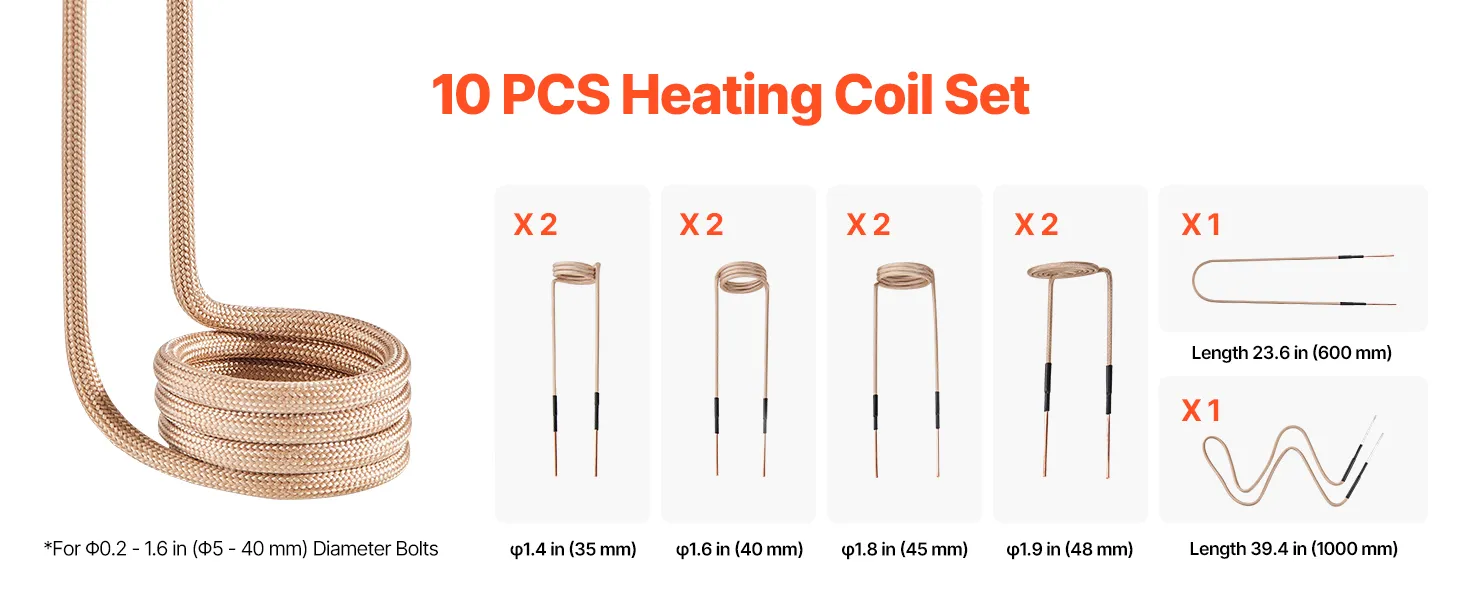 Three coil sizes meet common small metal tasks such as riveting copper parts, washer nuts, pipe joints, and motorcycle bolts. The purple copper conductive wire is more efficient than regular copper wire, and the glass fiber insulation layer offers superior resistance to breakage.