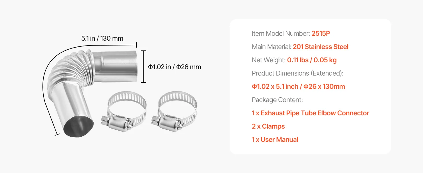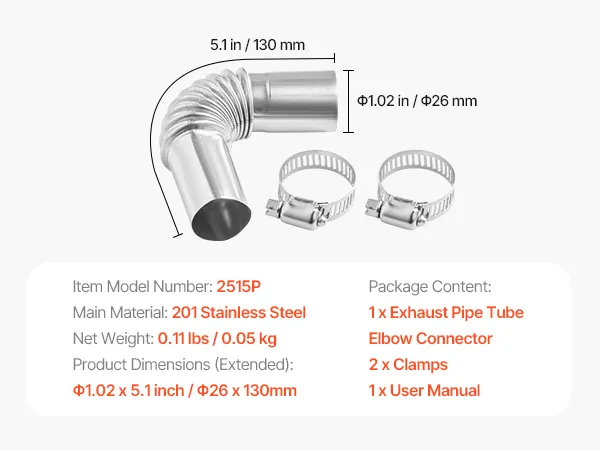 Kit connettori e morsetti: il kit connettori per condotti di scarico include un collettore di scarico a gomito e due morsetti, fornendo tutto il necessario per l'installazione e la manutenzione. Garantisce uno scarico stabile dei gas di scarico
