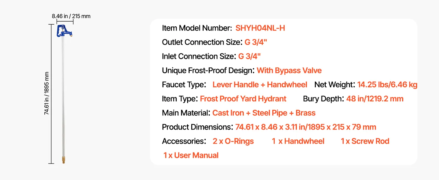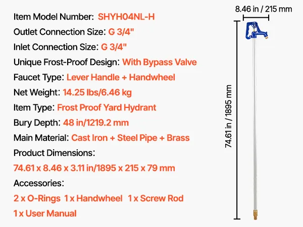 L'idrante da giardino antigelo presenta una lunghezza totale di 1895 mm, una profondità di interramento di 122 cm. La struttura resistente riduce le perdite e garantisce la durata, perfetto per l'irrigazione del giardino, la pulizia dell'auto e l'irrigazione agricola.