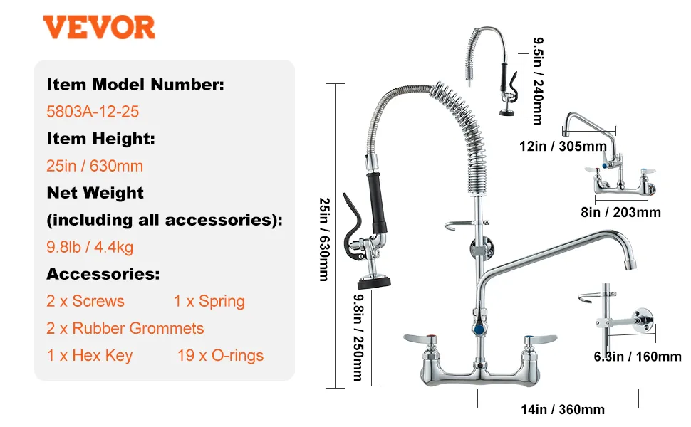 VEVOR Rubinetto Commerciale con Spruzzatore Pre-risciacquo, Altezza 630 mm Interasse 203 mm Bocca Girevole 305 mm Montaggio a Parete, Dispositivo Ottone Getto Abbassante, Lavello da 1/2/3 Scomparto