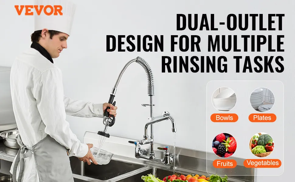 Questo rubinetto di prerisciacquo è dotato di uscite sia alte che basse. La pistola a spruzzo è dotata di un eccellente potere di lavaggio forte, ottenendo un risciacquo efficace e un'ampia copertura. Il rubinetto rotante eroga l'acqua delicatamente, ideale per lavare frutta e verdura.