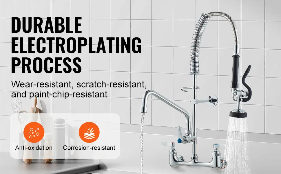 La superficie del rubinetto da cucina commerciale è sottoposta a un preciso processo di galvanizzazione, che offre eccezionali proprietà antiossidanti e anticorrosione. Sia il rubinetto che il tubo di prerisciacquo sono realizzati in acciaio inossidabile 304 per una maggiore durata.