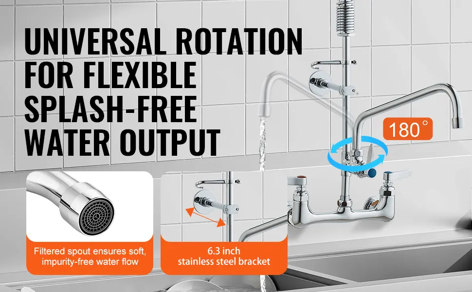 Rubinetto commerciale a parete: questo rubinetto di prerisciacquo alto 630 mm è progettato per l'installazione a parete nelle pareti della cucina, dotato di una testina di spruzzo e di un rubinetto girevole da 305 mm, affrontando facilmente sfide complesse e difficili legate allo sporco. È adatto per l'uso con lavelli da cucina commerciali di livello professionale a 3 scomparti.