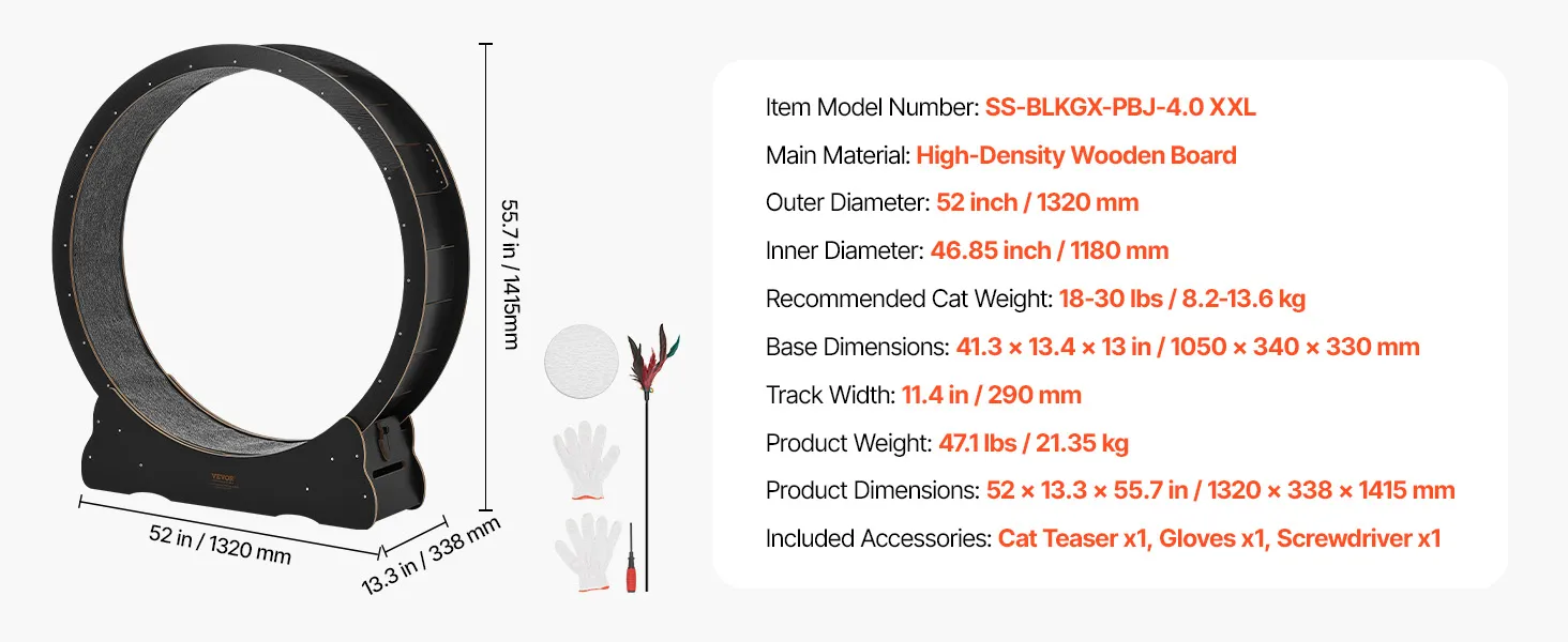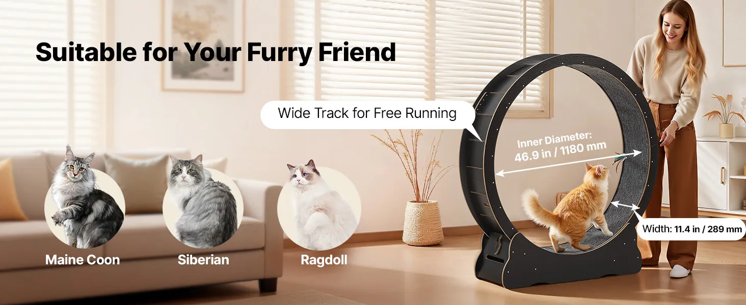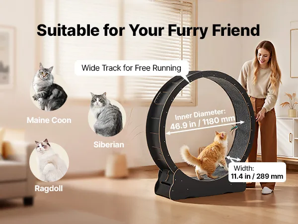 Spaziosa per gatti di taglia media e grande: con un diametro esterno di 1320 mm e un diametro interno di 1180 mm, questa ruota per gatti supporta gatti fino a 12,7 kg. Con una larghezza di 35,6 cm, offre ampio spazio per gatti di taglia media