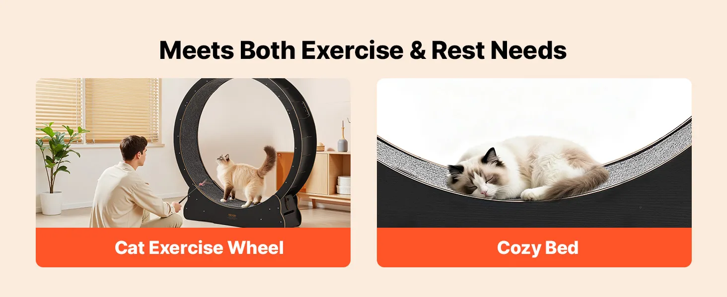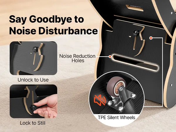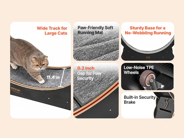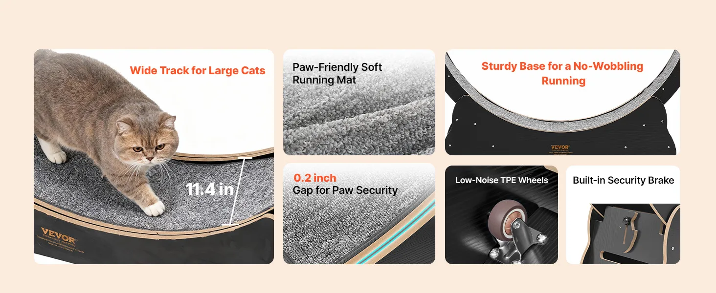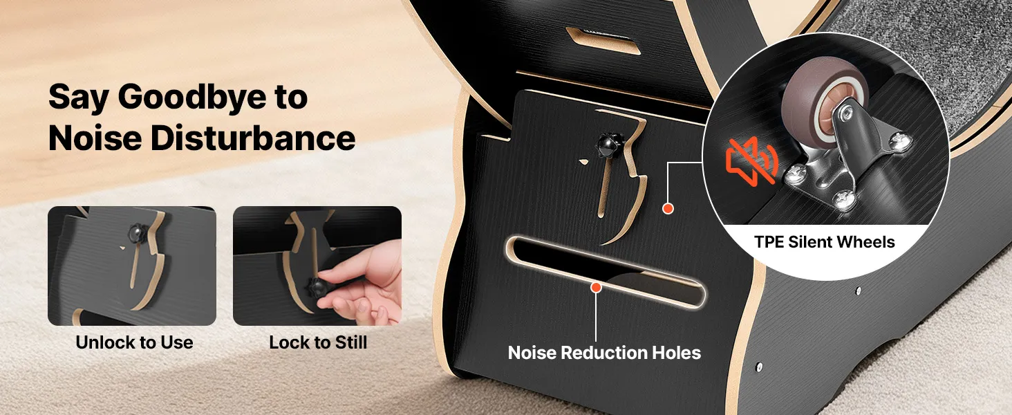 Sia le ruote scorrevoli che quelle di arresto sono realizzate in TPE silenzioso, che offre ammortizzazione e riduzione delle vibrazioni per ridurre al minimo il rumore. Lascia che il tuo gatto, attivo di notte, corra liberamente senza disturbare la tua quiete.