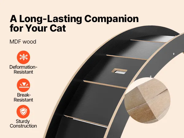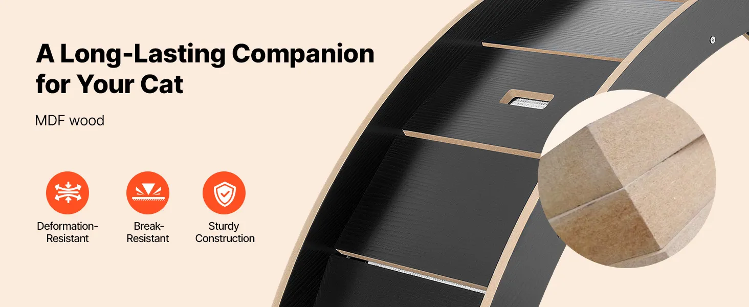 Telaio in legno resistente: realizzata in legno ad alta densità da 12 mm, ruota per gatti resiste all'umidità, resistendo al gioco energico senza deformarsi. Occupando 0,45 m², è ideale per offre al gatto tutto spazio necessario per esercitarsi