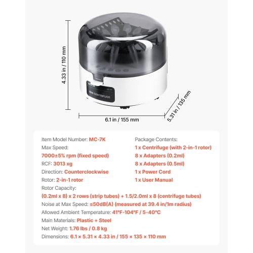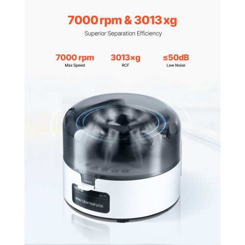 VEVOR Mini Centrifuga 3013 xg RCF, Centrifuga da Laboratorio Elettrica con Rotore per Provette da 0,2/1,5/2 ml, Velocità Fissa 7000 Giri/min, Bassa Rumorosità per Esperimenti di Laboratorio