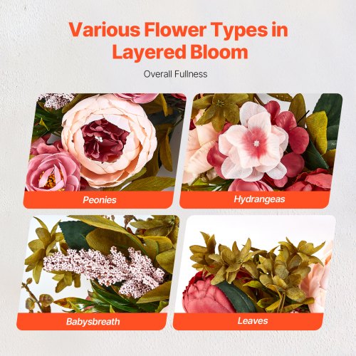 VEVOR Ghirlanda Decorativa Artificiale, 48,26 cm, Rosa, Decorata conPeonie, Ortensie, Velo di Bambino, Ghirlanda per Tutto l'Anno per Decorazioni Interni Esterni, Pareti di Casa, Festival, Matrimoni