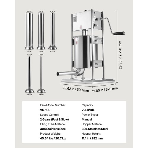 VEVOR Insaccatrice Manuale per Salsicce, Insaccatrice Verticale per Carne da 10 L, a Doppia Velocità, per Impieghi Gravosi in Acciaio Inox con 5 Tubi di Insacco, per Uso Commerciale e Domestico