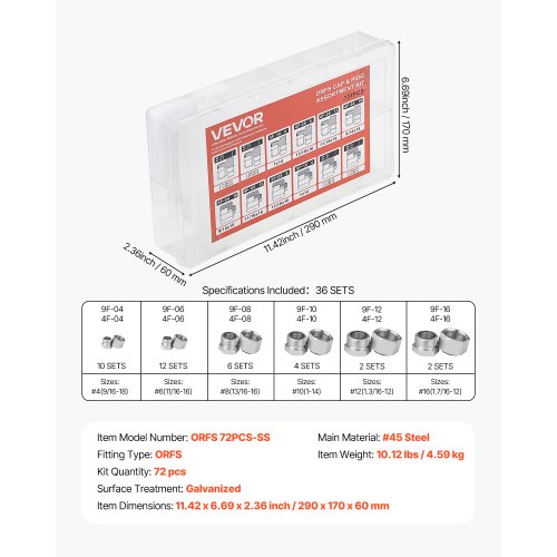VEVOR Raccordi Idraulici ORFS, 72 Pezzi, Kit di Raccordi con Guarnizione Frontale O-Squillo, Raccordi per Tubi Flessibili Idraulici e Tubi, Filettatura di Precisione, Misure 4 6 8 10 12 16