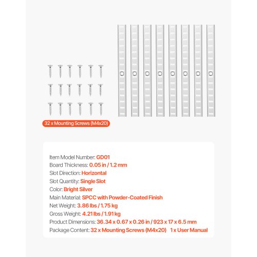 VEVOR Pilastri per Mensole, Staffe per Mensole Regolabili in Acciaio inox, Inserti per Strisce di Pilastri con 32 Viti, per Scaffalature a Parete, Armadio, 923 x 17 x 6,5 mm 8 Pezzi