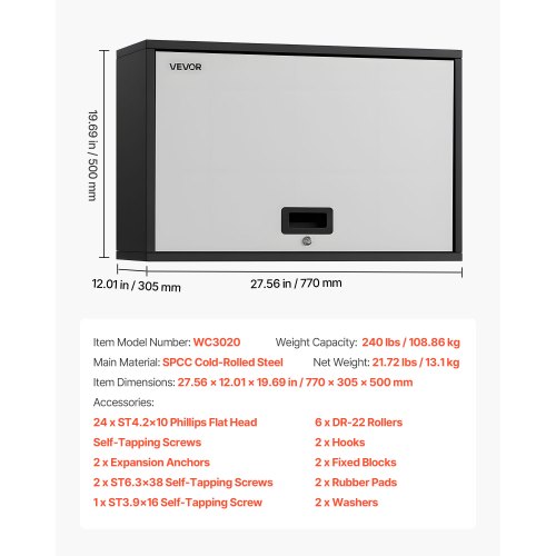 VEVOR Mobiletto da Parete in Metallo, 770 x 305 x 356 mm, Mobiletto Portautensili Sospeso con Ante a Ribalta, Capacità di Carico 54,5 kg per Garage, Cantina, Cucina, Montaggio Richiesto