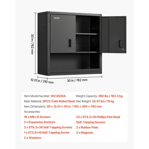 VEVOR Mobiletto da Parete in Metallo, 762 x 305 x 762 mm, Mobiletto Sospeso in Acciaio con Ante con Serratura e Ripiano Regolabile per Garage, Cantina, Cucina, Montaggio Richiesto, Nero