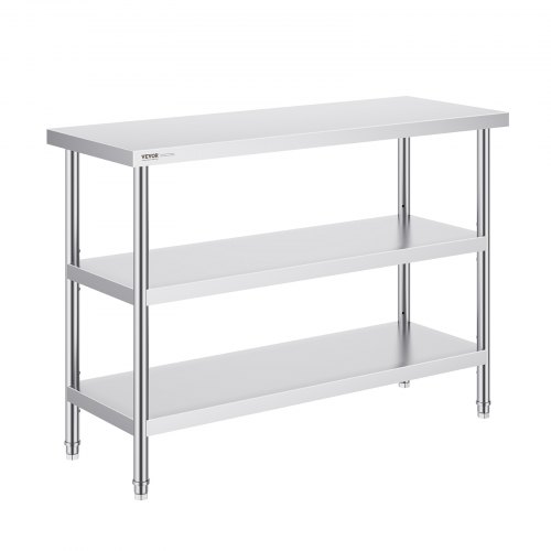 VEVOR Tavolo da Lavoro in Acciaio Inossidabile 610 x 1219 x 864 mm, con 4 Ruote, 3 Livelli di Altezza Regolabili, Tavolo Resistente per Preparazione Alimenti Ristoranti Cucina Commerciale, Argento