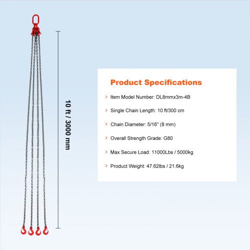 MOH Catene di Sollevamento a 4 Gambe G80, 8 mm x 3 m Imbracatura per Catena di Sollevamento in Acciaio (3 m con capacità di carico 5 T) per Macchinari, Fabbriche, Magazzini