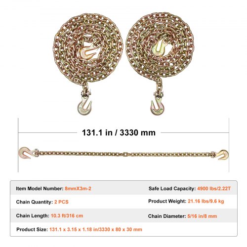 VEVOR Catena di Traino con Ganci a Forcella 2 Pezzi Catene di Trasporto G80 10 mm x 316 cm, Carico Catena per Tronchi 3,22 Tonnellate, per Fissaggio di Attrezzature per Carro Attrezzi