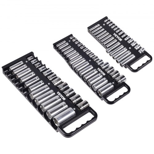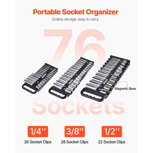 VEVOR Vassoio Porta-Bussole Portatile 3 Pezzi, Set Porta-Bussole Metrico e SAE 1/4 3/8 1/2 Pollici con Maniglia Base Magnetica per Cassetto della Cassetta degli Attrezzi, Contiene Fino 76 Bussole