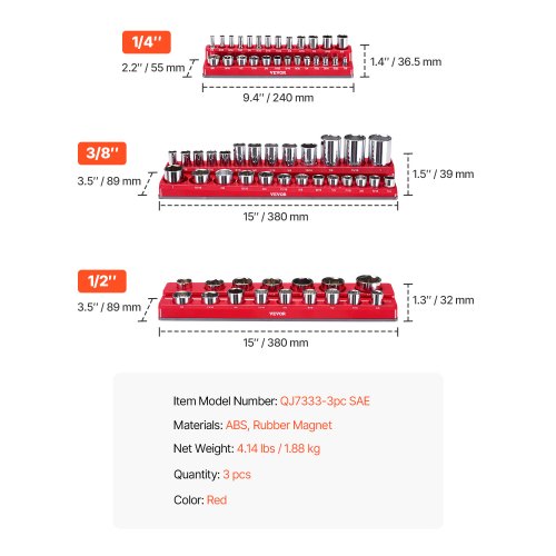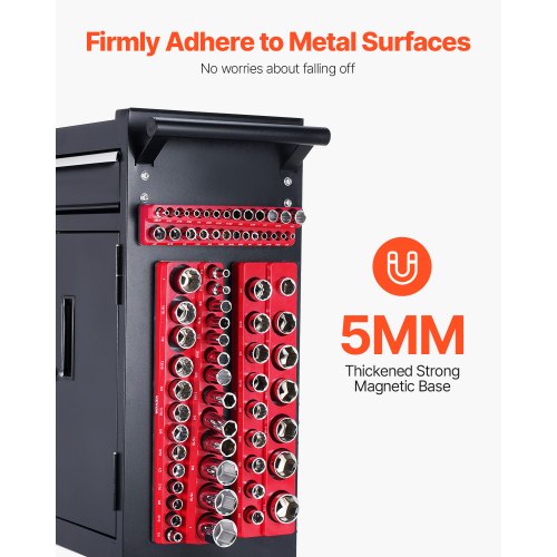 VEVOR Set di Organizzatore per Prese Magnetiche, 3 Supporti Magnetici per Prese, Vassoi per Prese SAE 1/4 3/8 1/2 Pollici Contengono Fino a 68 Prese Standard e Profonde, Rosso (Prese non Incluse)