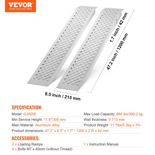 VEVOR Rampe in Alluminio, 8810 libbre, Rampa di Carico Universale per Moto, Trattore, ATV/UTV, Camion, Tosaerba, 72"L x 15"L, 2 Pezzi
