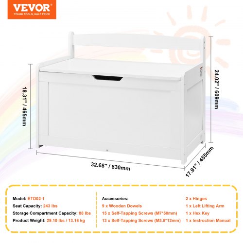 VEVOR Baule Portagiochi in Legno per Bambini 830 x 455 x 609 mm Grande Panca Portaoggetti per Bambini Piccoli con Coperchio a Ribalta e Cerniera di Sicurezza, per Sala Giochi, Camera da Letto, Bianco