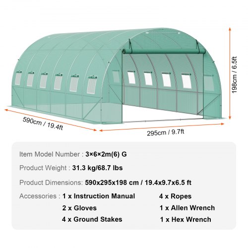 VEVOR Serra a tunnel walk-in 3,9 x 1,9 x 1,8 m orto, Serra a film tunnel per piante, Serra con telaio in acciaio zincato, Copertura in PE verde, Porta avvolgibile con cerniera 6 finestre esterne