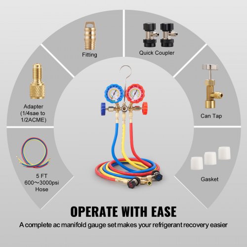 VEVOR Set di Manometro del Refrigeranti a 3 Vie per R134A R22 R12 R502 per l'Aria Condizionata Uso Automobilistico, Set Indicatore del Collettore AC per Refrigeranti con Valigetta 28,4 x 25 x 8,9 cm