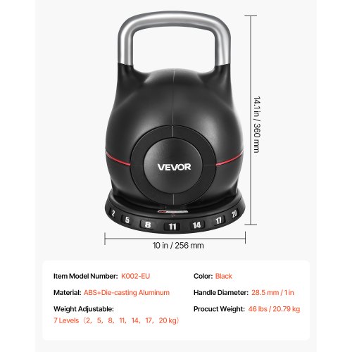 VEVOR Kettlebell Regolabile, con 7 Livelli di Peso 2/5/8/11/14/17/20 kg, Manubrio in ABS e Alluminio Pressofuso per Allenamento della Forza di Presa, Esercizio del Completo del Corpo Nero