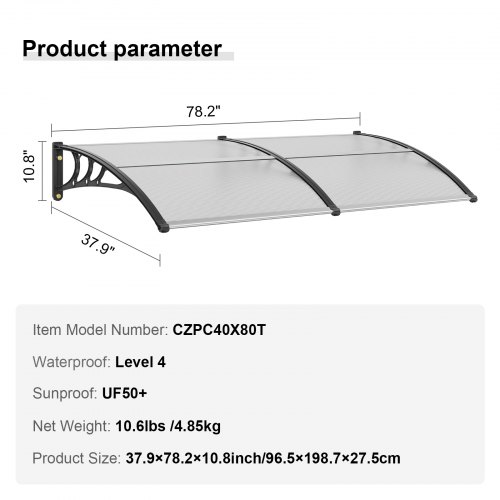 VEVOR Tettoia per Porta d'Ingresso 96.5 x 198.7 cm, Pensilina per Porta Esterna in Policarbonato Trasparente, Tettoia per Finestre UPF 50+ Copertura Tettoia per Porte Finestre Antipioggia Impermeabile