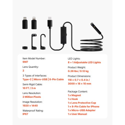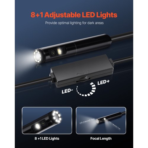 VEVOR Telecamera Endoscopica con Luce, Telecamera di Ispezione HD 1920P con 8 + 1 Luci LED, Boroscopio a Doppia Lente con Zoom 2X, Cavo Serpente da 3 m Impermeabile IP67 per Auto