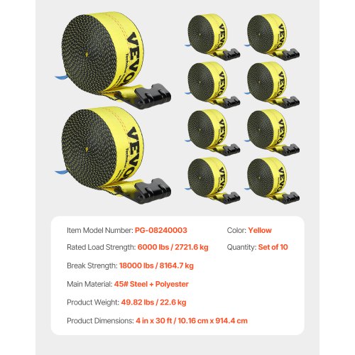 VEVOR Cinghie per verricello, 4" x 30', Capacità di carico 6000 libbre, Resistenza alla rottura 18.000 libbre, Cinghie per camion con gancio piatto, fattorie, soccorsi, giallo (confezione da 10)