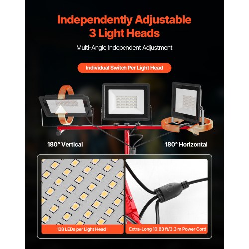 VEVOR Lampada da Lavoro a LED con Treppiede, 21000 Lumen, Lampada da Campeggio Portatile a Tre Teste con Interruttore Individuale, Cavo di Alimentazione da 3,3 m, Impermeabile IP65