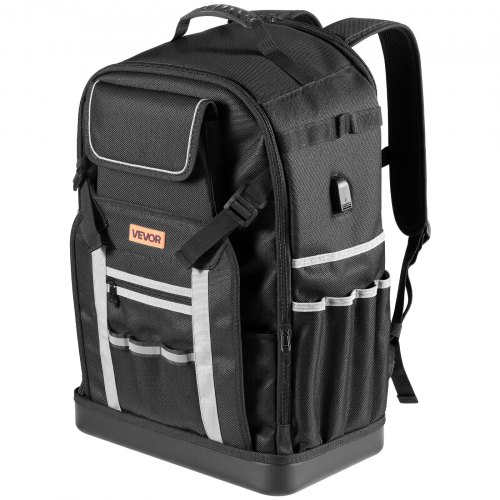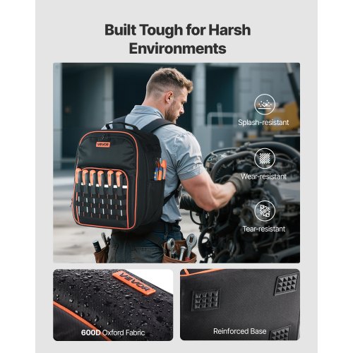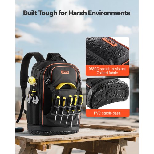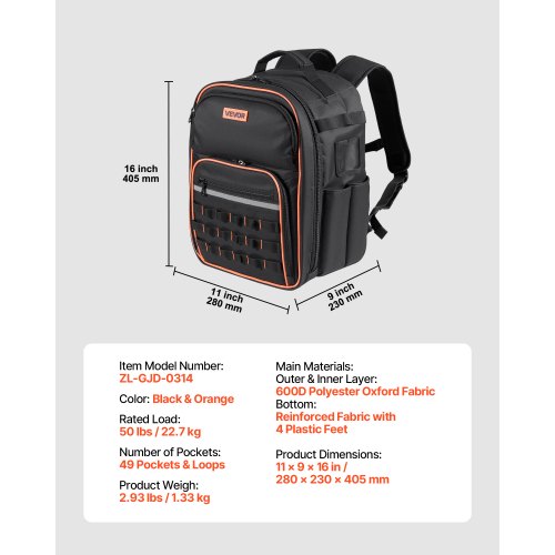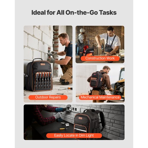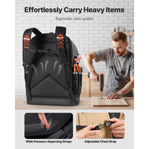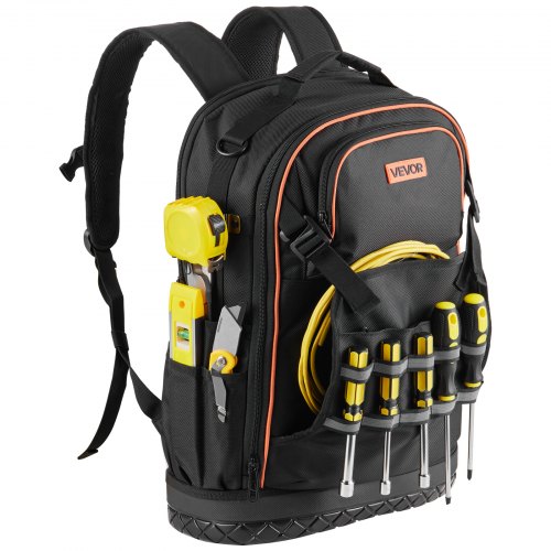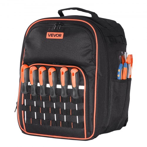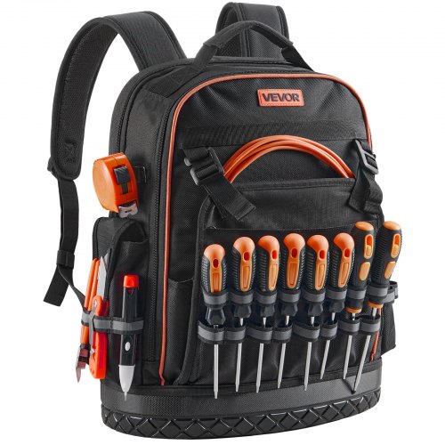 VEVOR Zaino Portautensili, 45 Tasche, Zaino Porta Attrezzi da Lavoro ad Alta Resistenza con Scomparto per Laptop e Base in Tessuto Rinforzato, per Elettricisti, Riparatori, Nero e Arancione