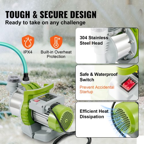 VEVOR Pompa da Giardino Portatile per Pozzi Bassi 1100W Prevalenza Max. 45m, Pompa Autoadescante per Giardino Cortile Ortaggio Velocità Max. 2750 giri/min, Pompa d'Acqua per Irrigazione da Giardino