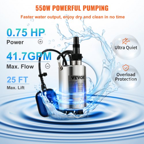 VEVOR Pompa ad Acqua Sommergibile 400 W Pompa Acque Scure Portata Elevata 9500 L/H Prevalenza 7,9 m Cavo di Alimentazione per Scaricare l'Acqua dal Seminterrato dello Stagno del Giardino della Piscina